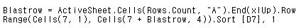 Range(왼쪽 위의 셀의 좌표, 오른쪽 아래 셀의 좌표) , sort(기준 될 열) , 0 or 1 (0:오름차순 1: 내림차순)
